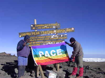 Auf dem Treffen erzählten uns Regina und Michael, dass Michael eine Kilimanjaro-Besteigung machen werde und ein Regenbogen-Tuch mit den Kindern von „Leben ohne Dich“ mitnehmen würde.